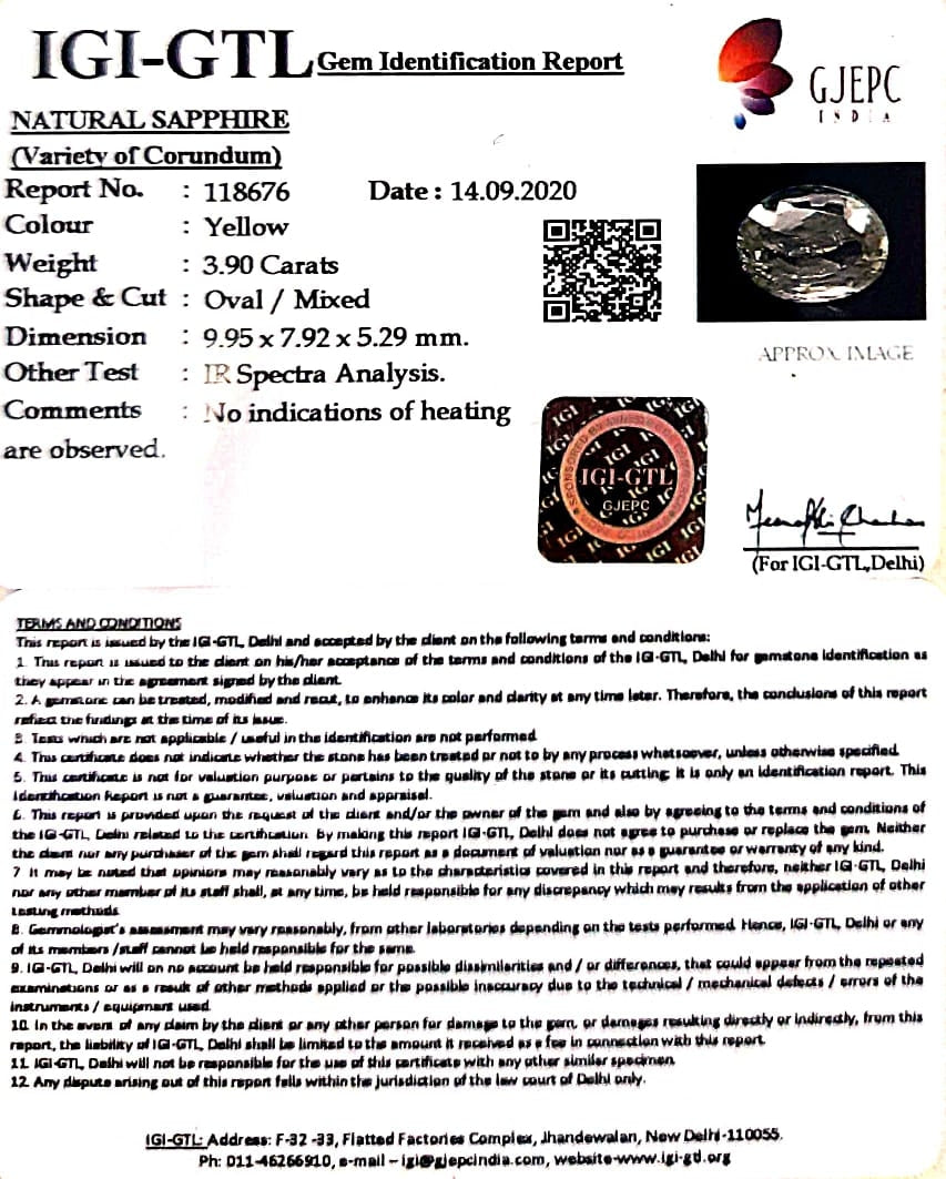 3.89/CT Natural Yellow Sapphire With Govt Lab Certificate