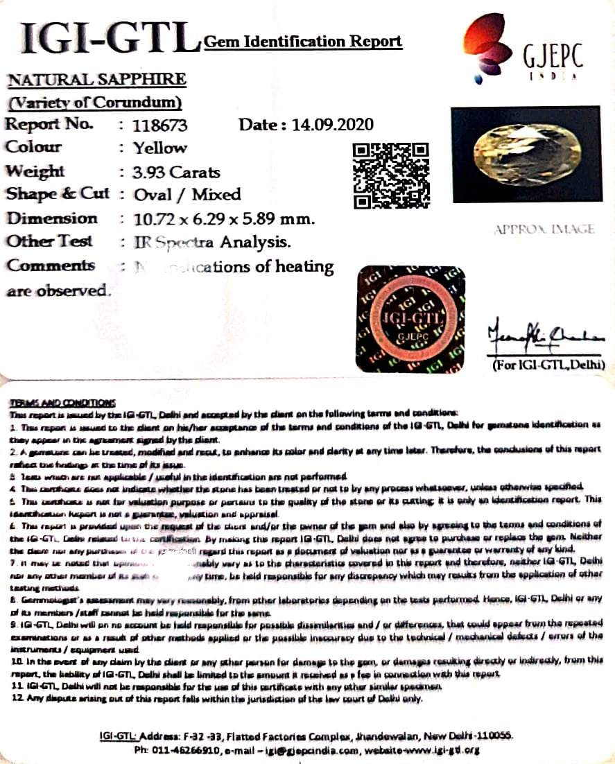 3.93/CT Natural Yellow Sapphire With Govt Lab Certificate (23310)
