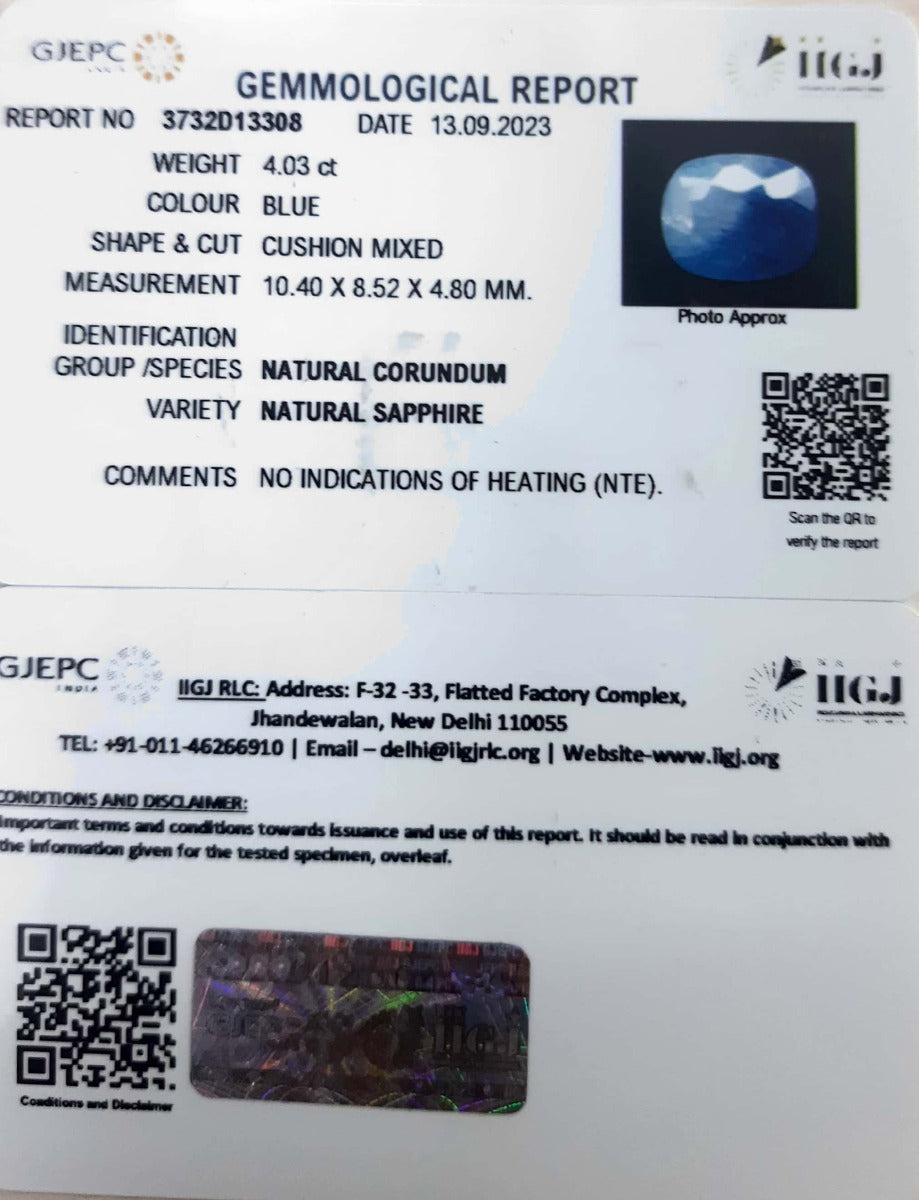 4.02/CT Natural Blue Sapphire with Govt Lab Certificate-BLUSA9S