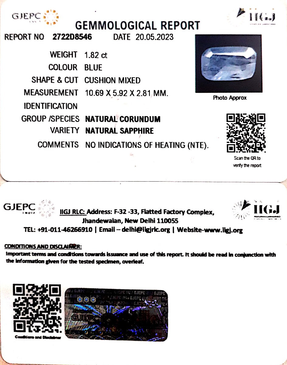 1.82/CT Natural Blue Sapphire with Govt Lab Certificate (BLUSA9S)