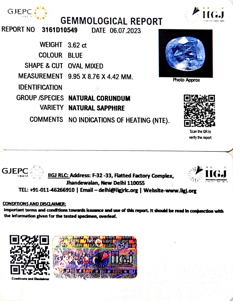 3.62/CT Natural Blue Sapphire with Govt Lab Certificate-BLUSA9S