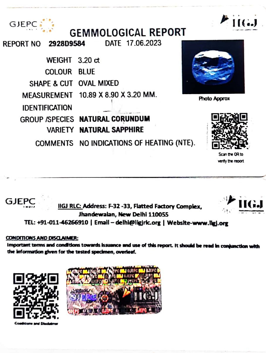 3.20/CT Natural Blue Sapphire with Govt Lab Certificate (6771)