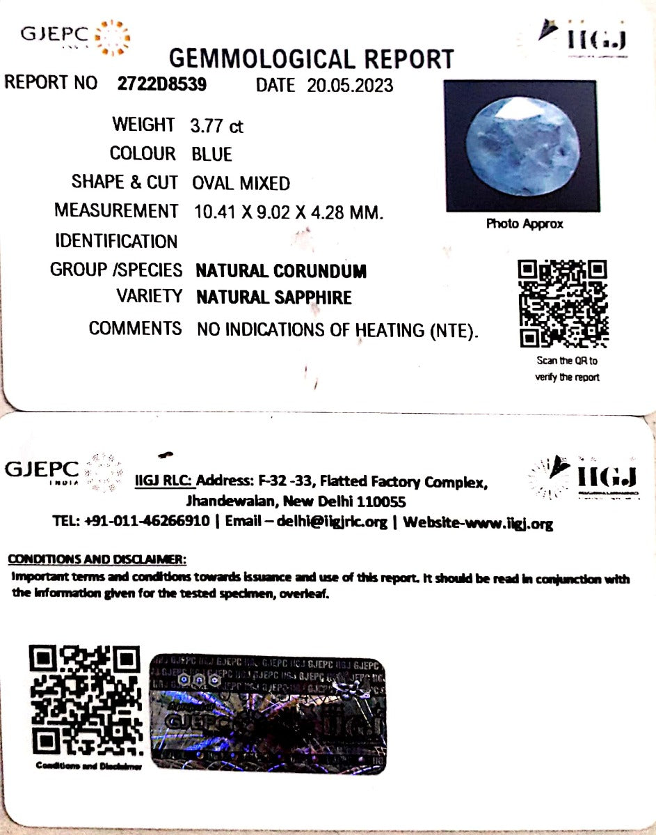 3.82/CT Natural Blue Sapphire with Govt Lab Certificate-BLUSA9T