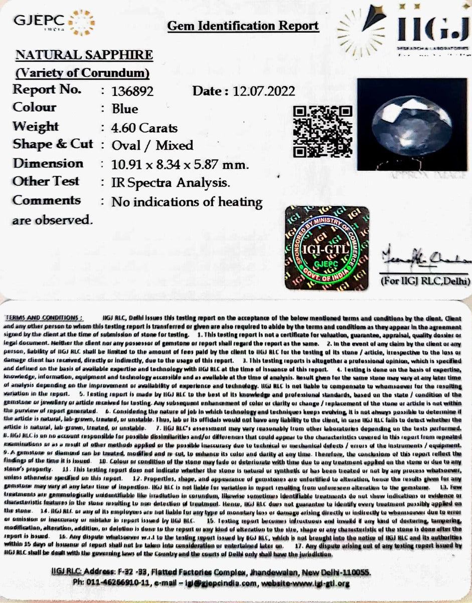 4.60/CT Natural Blue sapphire with Govt Lab Certificate-BLUSA9T