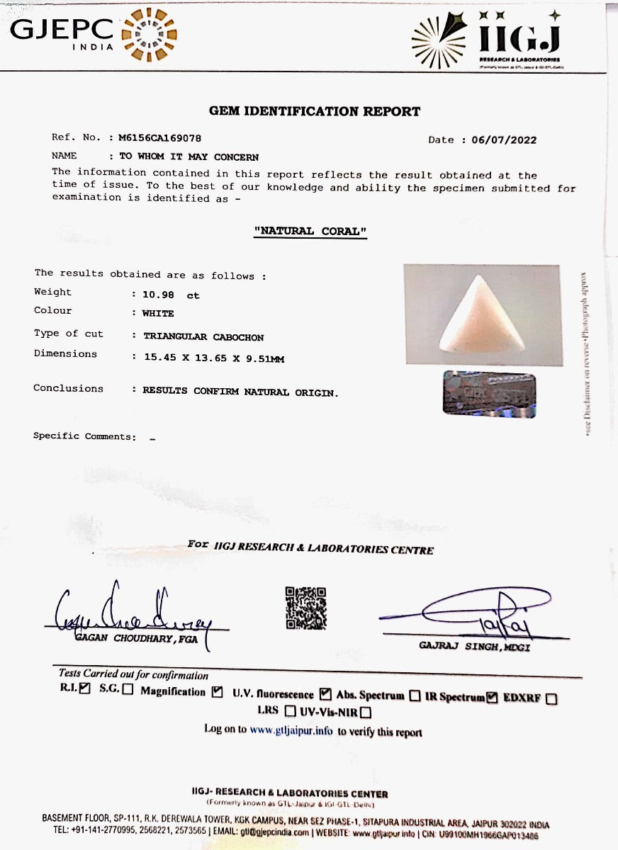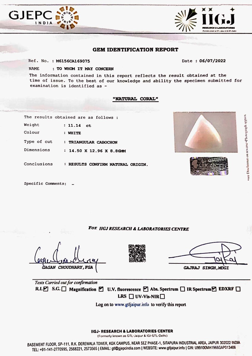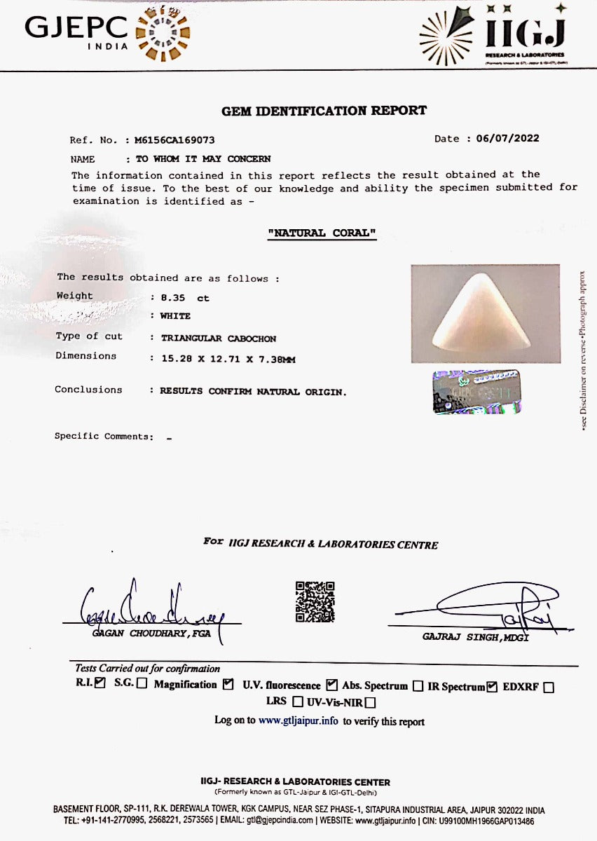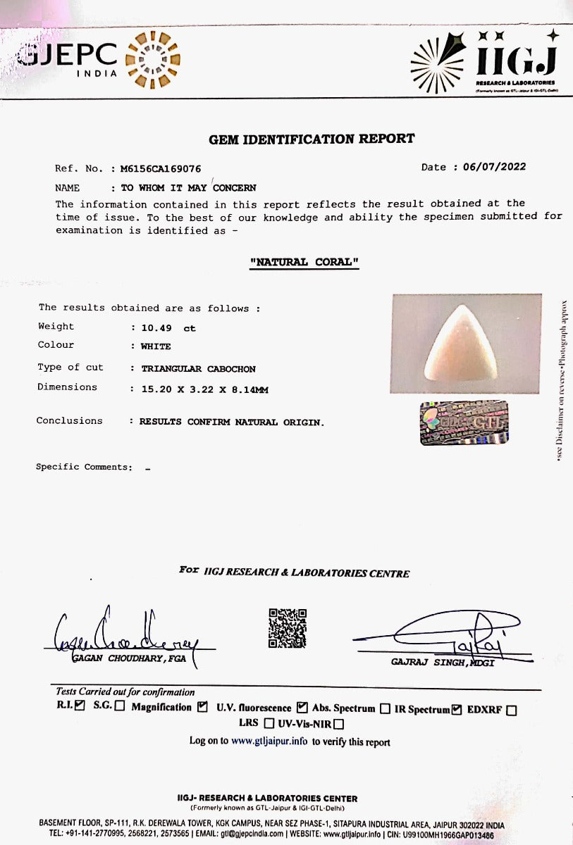 12.43/CT White Coral With Govt. Lab Certified (1500)