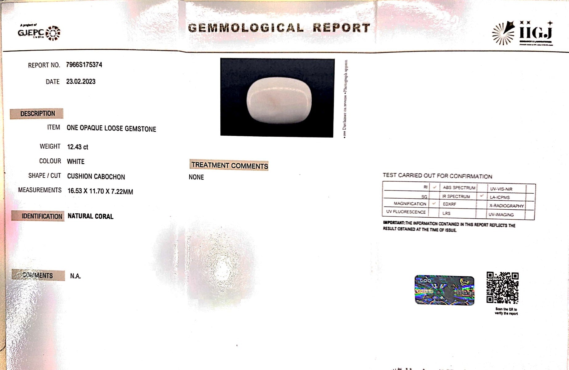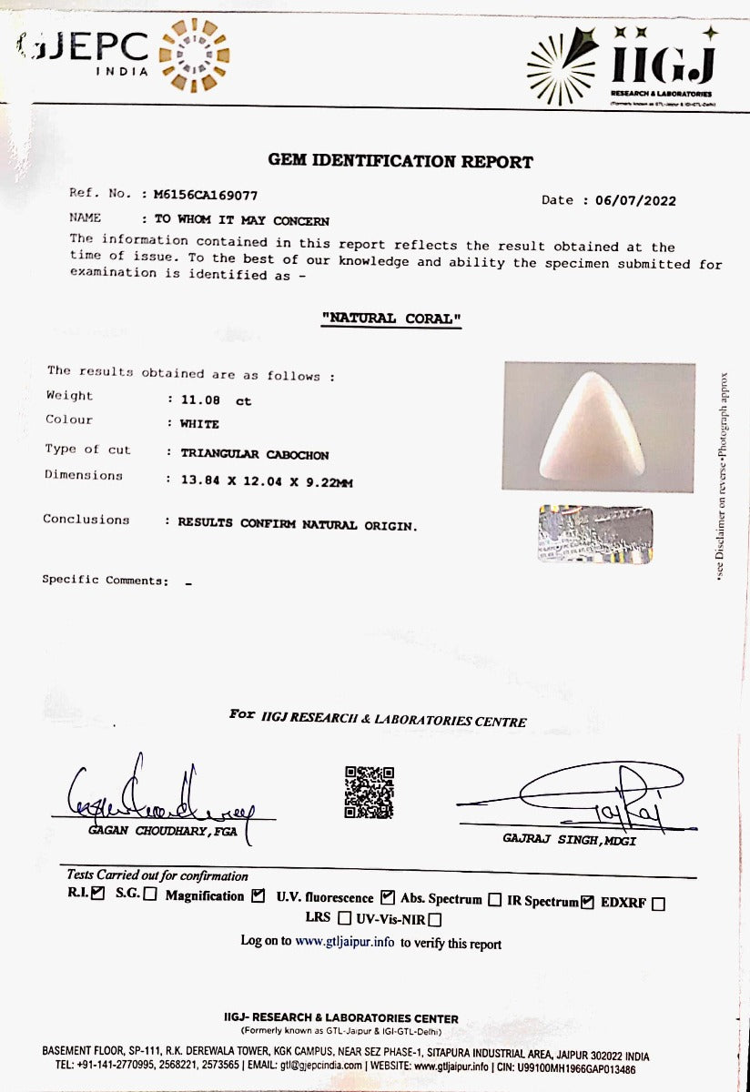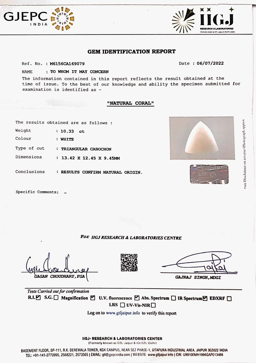 12.43/CT White Coral With Govt. Lab Certified (1500)