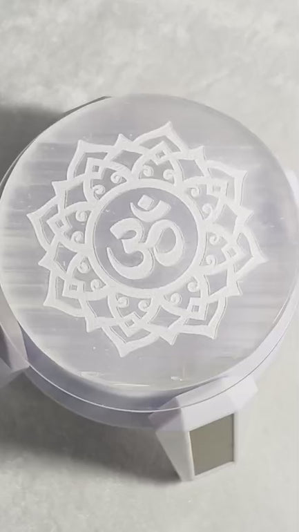 The Om Selenite Charging Plate is a beautifully crafted spiritual yantra made from natural, high-quality selenite. Gem Selections provides this govt lab certified plate featuring an engraved OM symbol, which is known for its powerful energy that cleanses negative vibrations and promotes peace, clarity, and spiritual growth. This plate can be used to recharge and purify crystals or jewelry by placing them on its smooth surface. Its calming energy supports meditation, chakra balancing, and energy healing, making it a perfect addition to any sacred space or wellness routine.